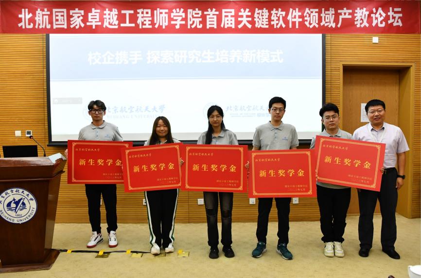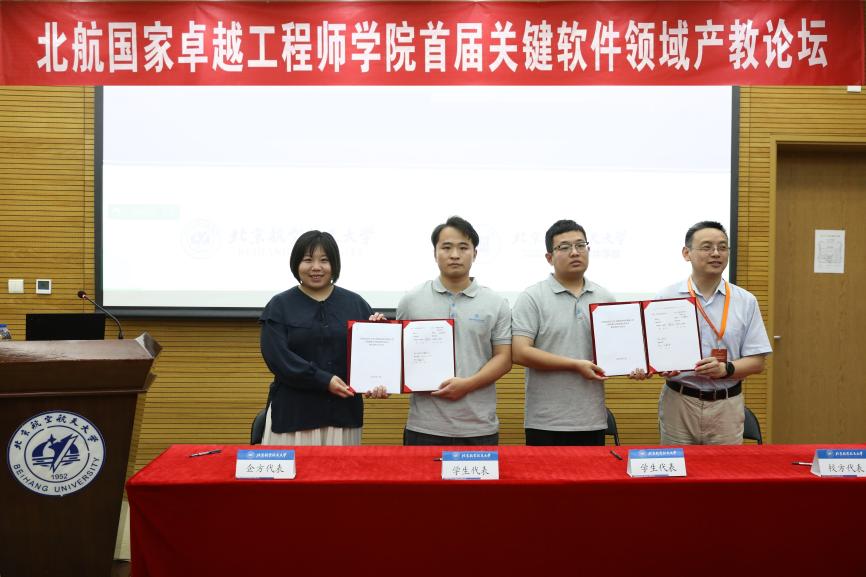 会上,胡春明院长介绍北航关键软件领域卓越工程师的培养情况和未来发展规划。随后,校方代表、联合培养企业代表、学生代表共同签署校企联合培养三方协议,2022级关键软件领域学生代表领取新生奖学金证书。
