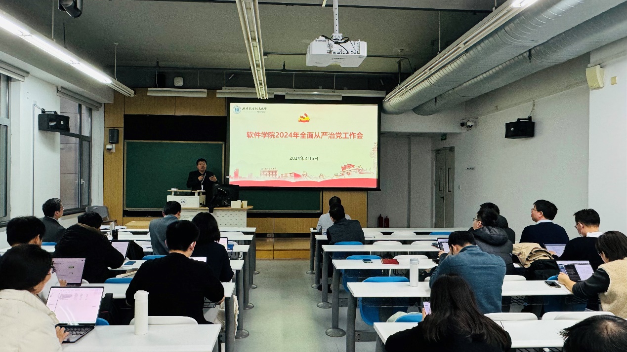 3月6日下午,软件学院召开2024年全面从严治党工作会议。会议坚持以习近平新时代中国特色社会主义思想为指导,深入学习贯彻习近平总书记关于党的自我革命的重要思想,认真学习贯彻二十届中央纪委三次全会精神,传达学校全面从严治党工作会议精神,贯彻落实学校有关要求,总结2023年全面从严治党工作,部署2024年重点任务。学院全体教职工参加会议。